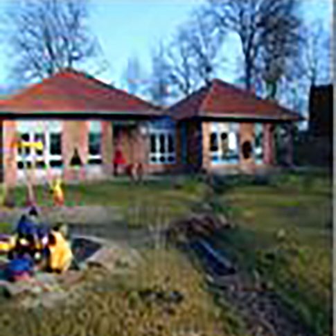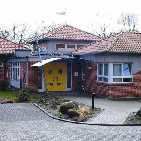 Entwurf und Neubau eines Kindergartens. Kleinkinder haben eine andere Wahrnehmung der Räume als Erwachsene. Hierauf wurde beim Entwurf eingegangen und so gibt es im Kindergarten sehr unterschiedliche Raumhöhen. In der zentralen Halle ist eine umlaufende