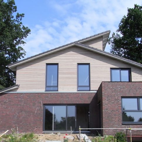 Nach Abbruch des Altbaus bis zur Kellerdecke, wurde ein modernes Architektenhaus mit Pultdach aufgebaut. Es wurde besonderer Wert auf großzügige Fensterflächen zur Gartenseite gelegt, sowie auf einen offenen Wohn-, Ess- und Küchenbereich gelegt.